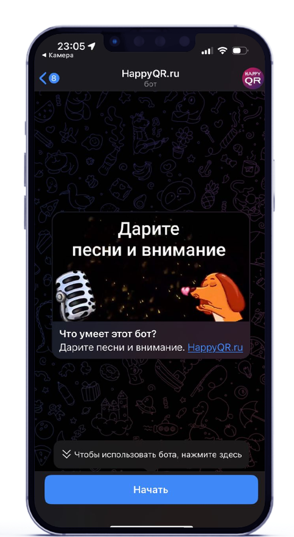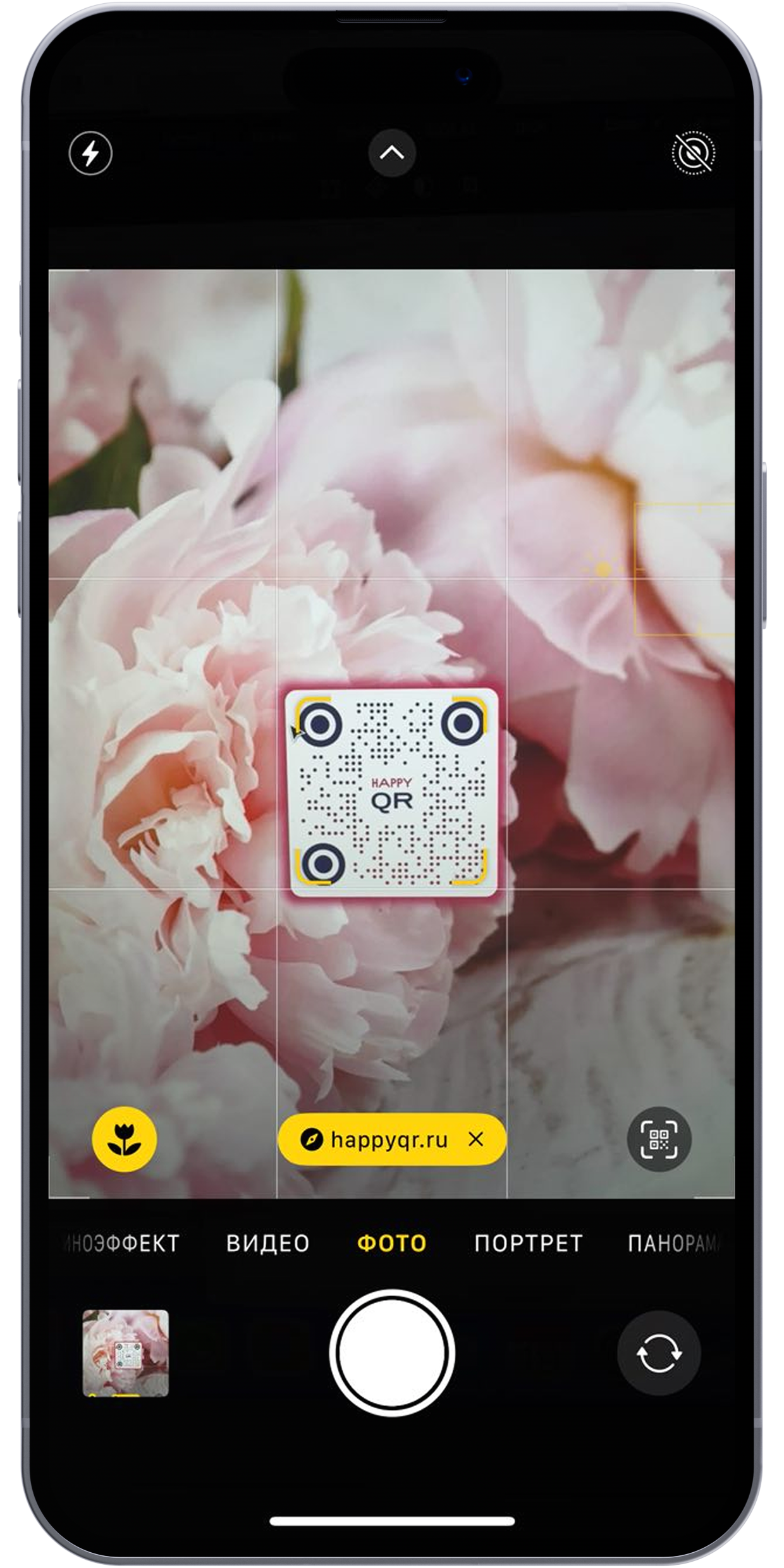 Даритель наводит камеру на QR-код и попадает в чат-бот HappyQR